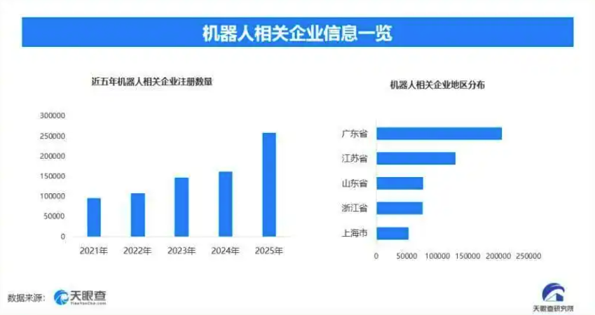 事实上,马年春晚过后,就带动了机器人租赁市场升温。天眼查专业版数据显示,截至目前我国现存在业、存续状态的机器人相关企业超108.6万家。其中,2026年截至目前新增注册相关企业约3.5万余家,从企业注册数量趋势来看,近五年间,机器人相关企业的注册数量呈现出逐年增长的态势,并在2025年达到顶峰。